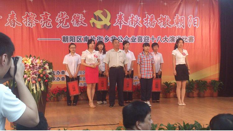 9月(yuè)10日(rì)下(xià)午14時(sh¥§í),由朝陽區(qū)委社會(huì)工(gōng)委主辦的(de)朝陽區(qū≤)南(nán)片街(jiē)鄉(xiāng)非公企業(yè)喜迎十八大(dà)演講比賽圓滿→± 結束。我公司人(rén)力資源部主管楊甜甜獲得(de)了(le)第三名的(de)好Ω®<(hǎo)成績。