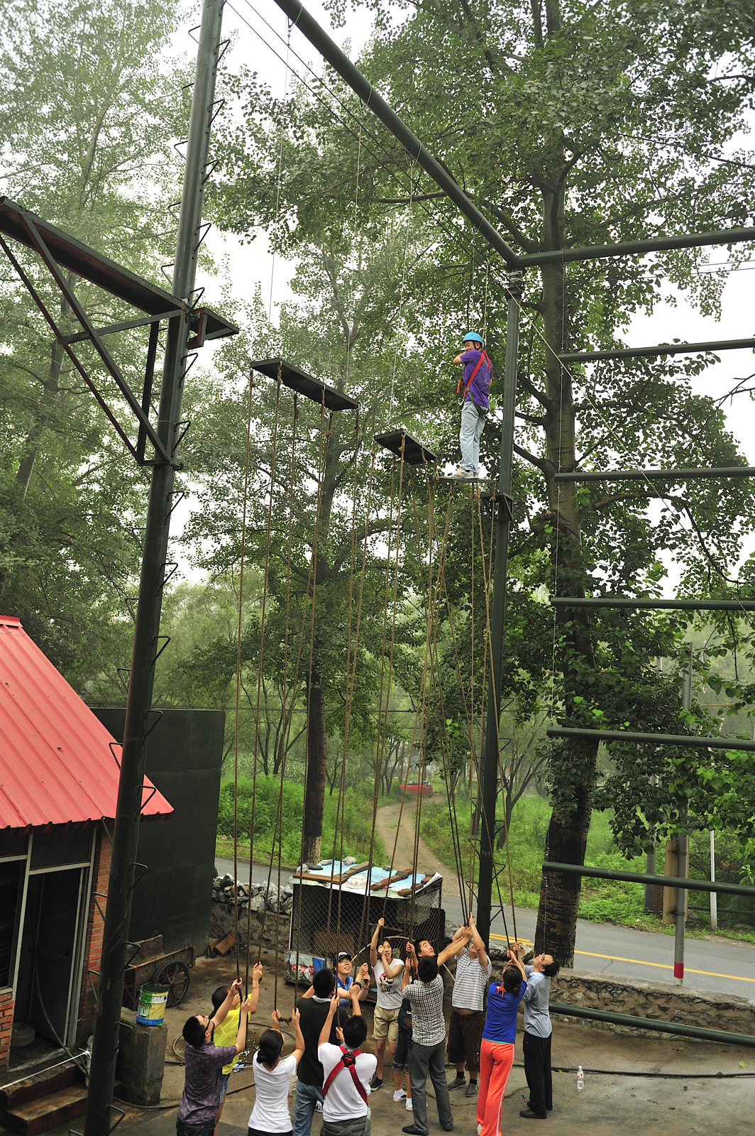 下(xià)午進行(xíng)的(de)是(shì)第二項,合力過橋。高(gāo)空(k≠₹'ōng)中懸吊著(zhe)三塊20公分(fēn)寬100公分(fēn)☆§α長(cháng)的(de)薄闆,中間(jiān)隔出一(yī)段距離(lí),排≤成一(yī)橫排。第一(yī)塊闆隻有(yǒu)一♥™→(yī)根鋼繩吊著(zhe),形成倒T字型,第二塊闆有(yǒu)兩根,形成一(yī)個±♣(gè)三角形,第三塊闆也(yě)是(shì)兩根,形♥÷成一(yī)個(gè)四邊形。三塊薄闆的(d≈ε•₩e)下(xià)方都(dōu)有(yǒu)6根≤®麻繩垂下(xià)來(lái),需要(yào)下(xià)面的(de)隊友(yǒγ↑®<u)拉住麻繩,力量傳遞到(dào)薄闆上(shàng),盡量使薄闆不(bù)晃蕩,φ₩ 并控制(zhì)兩邊的(de)薄闆可(kě)以對(duì)接,讓隊員←ΩΩ(yuán)能(néng)跨過去(qù)。這(∏ ©zhè)個(gè)可(kě)比空(kōng)中₹♠抓杠要(yào)危險多(duō)了(le),上(shàng)面的(de)薄闆很≤λ₩♥(hěn)容易前後左右搖晃,讓過橋的(de)隊員(yuán)非常沒有(yǒu)安 ✘全感。但(dàn)是(shì)很(hěn)多(d₩ λ±uō)隊員(yuán)都(dōu)表示實際做(zuò)完以後,感覺比空(k↑©ōng)中抓杠容易,因為(wèi)知(zhī)道(dào)下(xià)面有(yǒu)隊友(yǒ$®&★u)在拉著(zhe)麻繩,在出力,在固定薄闆的(de)位置,心裡(lǐ)就(jiù)暖暖的(de∏π↕),特别踏實,就(jiù)不(bù)會(huì)π♠"害怕前面的(de)困難和(hé)危險,放λ≈(fàng)心大(dà)膽地(dì)跨過這(zhè)“斷橋♥§™”。大(dà)家(jiā)都(dōu)覺得(de)這(zhè)個(gè)項目太考驗團隊的(de)協±↓≥作(zuò)能(néng)力了(le),如(rú)果沒有(yǒu)大(dà)家(jiāΩγ< )的(de)努力,憑自(zì)己去(qù)完成真的(de)太難太難了(le)。