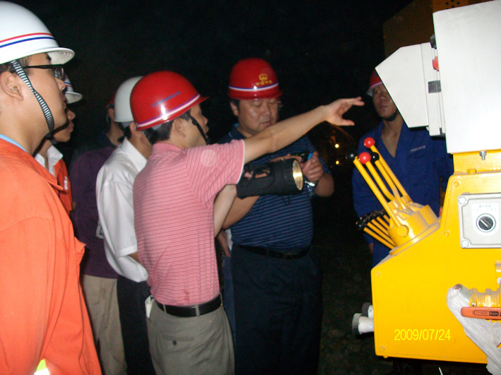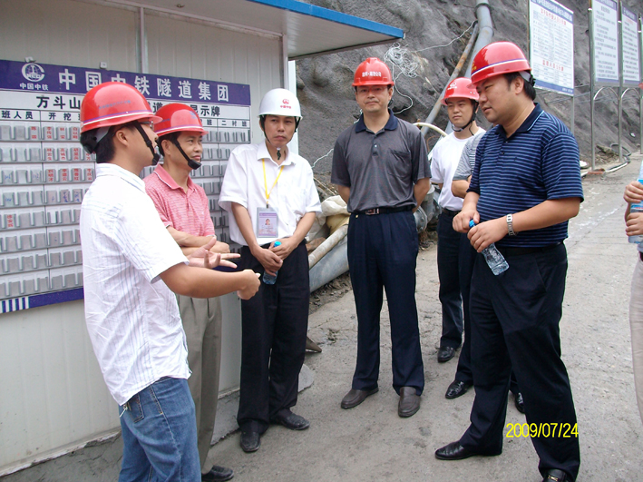 渝黔鐵(tiě)路(lù)領導在方鬥山(shān)隧道(dà&αo)正洞內(nèi)非常感興趣地(dì)仔細詢問(wèφ×'n)價值400萬的(de)RAD-150C型号地(dì)質超前預報(bà♠§₹↓o)鑽孔台車(chē)的(de)工(gōng)作(zuò)性≤↔÷&能(néng)和(hé)超前地(dì)質預報(bào)工(g©<£ōng)作(zuò)的(de)開(kāi)展情況。